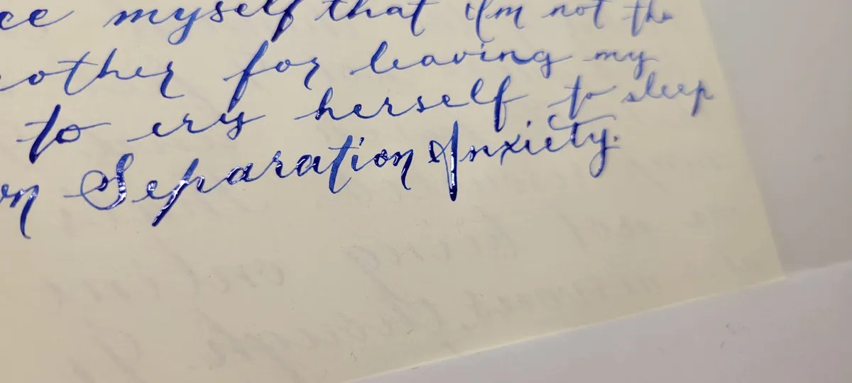 I’ve mostly done calligraphy today. The phrase of the day is separation anxiety. We are doing nap-sleep-training with Erica, because up til now she’s been unable to fall asleep for a nap while alone. She has consistently needed rocked or held. She’s getting better, but her separation-anxious screaming gives me… Separation anxiety. Sigh.