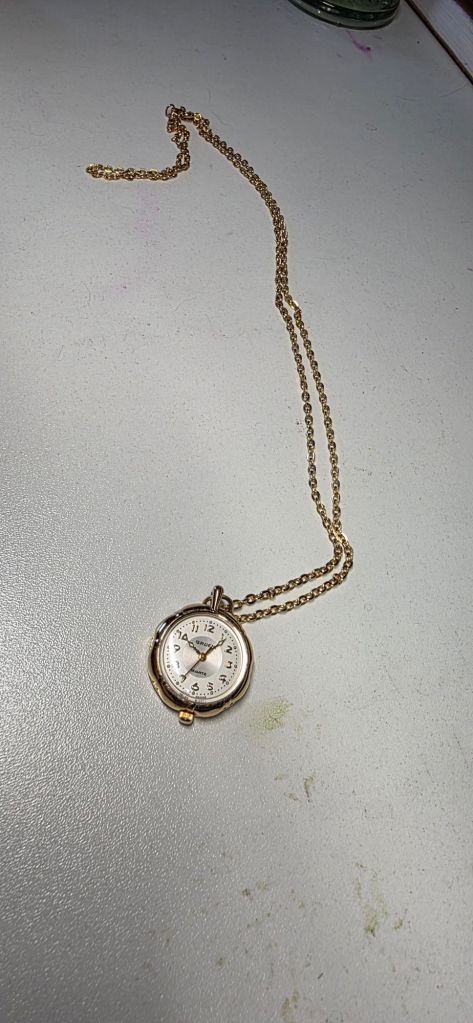 Had a nice day so far. Went out for breakfast, which was great, then we walked to a garage sale nearby. I got a lovely watch necklace that I’m hoping will work again once I replace the battery. It’s a year older than I am, and it cost me 50¢ cuz garage sales are nuts. It seems like it’s still in good condition, so I’m hopeful, but I’ll prolly end up wearing it either way.