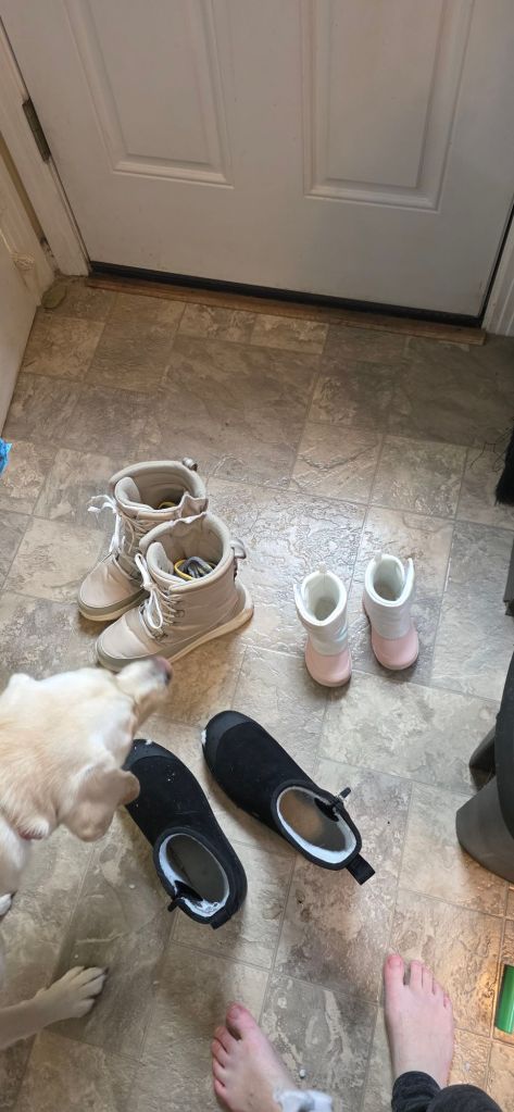 It was Erica’s first time out in snow today! She had a bunch of fun, big ole grin. It helps that she’s already been in love with her new snow boots… We let her wear them off and on the last few days to get used to walking in em. We built her a snowman but she was not very impressed 🤣